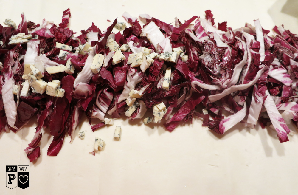 - Radicchio in Streifenschneiden & zu den Zwiebeln in die Pfanne und ebenfalls kurz anbraten, bis er zusammengefallen ist,