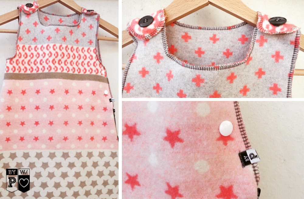 Als Vorlage diente der bereis sehr knappe Schlafsack, unten einfach um 20cm länger zugeschnitten, rundherum einfassen mit der Overlock, Reißverschluß einnähen (was wider erwarten gar nicht so schwierig ist), zusammennähen und fast fertig. Knopflöcher gehen dank der Knopflochfunktion der Nähmaschine ratz fatz, Knöpfe noch annähen und so sehen sie aus: